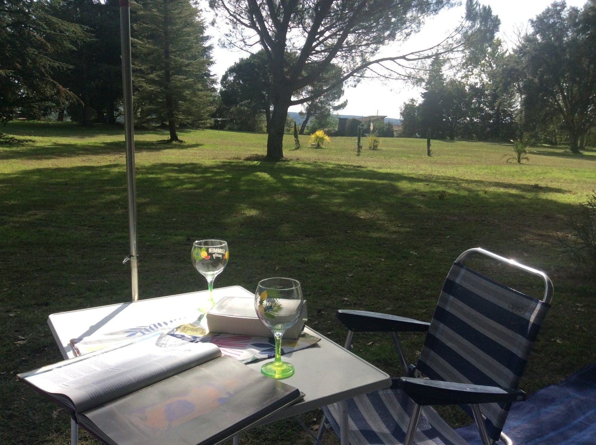 Je hebt een chemisch toilet in de caravan en een privé badkamer met douche en wc bij het zwembad op een kleine afstand. Alle gasten, maximaal 10, hebben privé sanitair zodat hygiëne gewaarborgd is. Op onze kindvrije glamping is rust en ruimte een verademing en kan je in alle stilte je boek uitlezen.